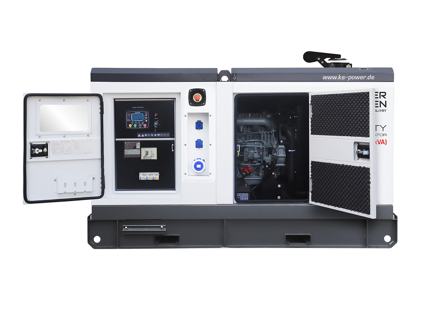 Carcasa are deschideri pentru ajutoarele de transport, facilitand transportul si instalarea unitatii. Usile largi cu balamale de ambele parti ale carcasei ofera acces neingradit la piesele unitatii pentru o intretinere usoara a componentelor principale ale generatorului diesel.