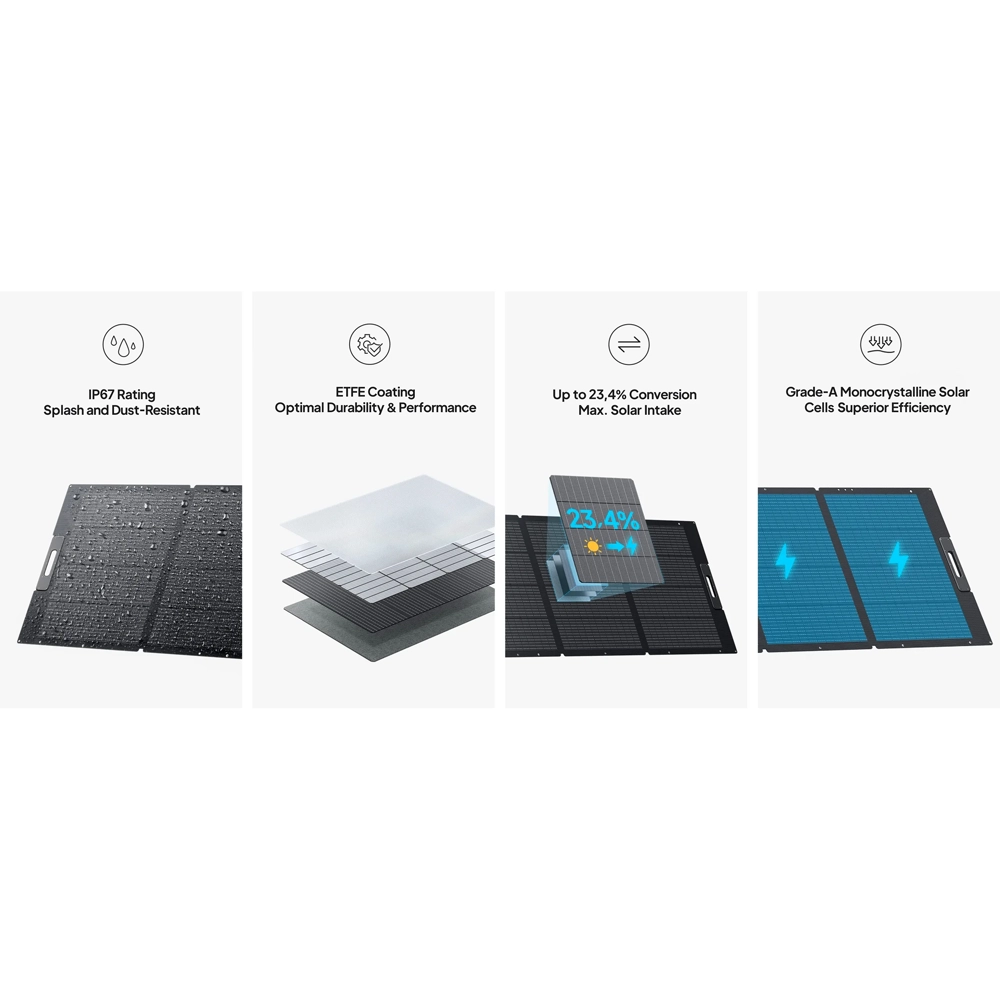 Bluetti PV350 este un panou solar pliabil de 350 W, special conceput pentru a alimenta eficient stațiile Bluetti sau pentru utilizări outdoor extinse. Are celule monocristaline de înaltă eficiență, un design robust și compatibilitate extinsă.