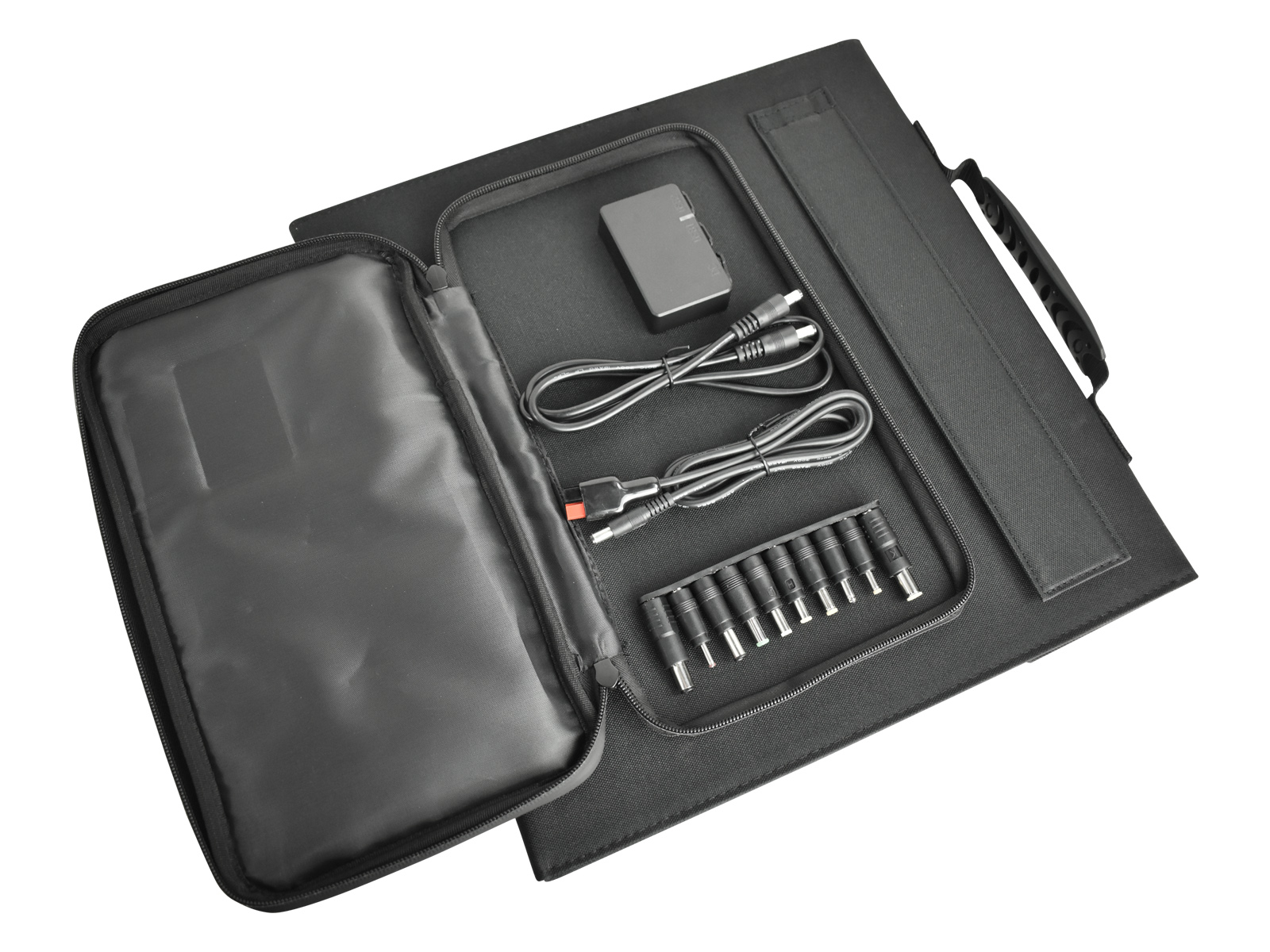 - Constructie extrem de compacta, pliabil, usor de transportat cu o singura mana. Are doua gauri in colturi pentru atasarea usoara la rucsacuri, copaci sau corturi cu carabiniere de calatorie. Dispozitivele care trebuie incarcate pot fi plasate intr-un buzunar cu fermoar, pastrandu-le in siguranta si curatenie. Posibilitatea de a lucra intr-o stare partial desfasurata va permite sa utilizati panoul intr-un spatiu limitat sau in timpul miscarii.