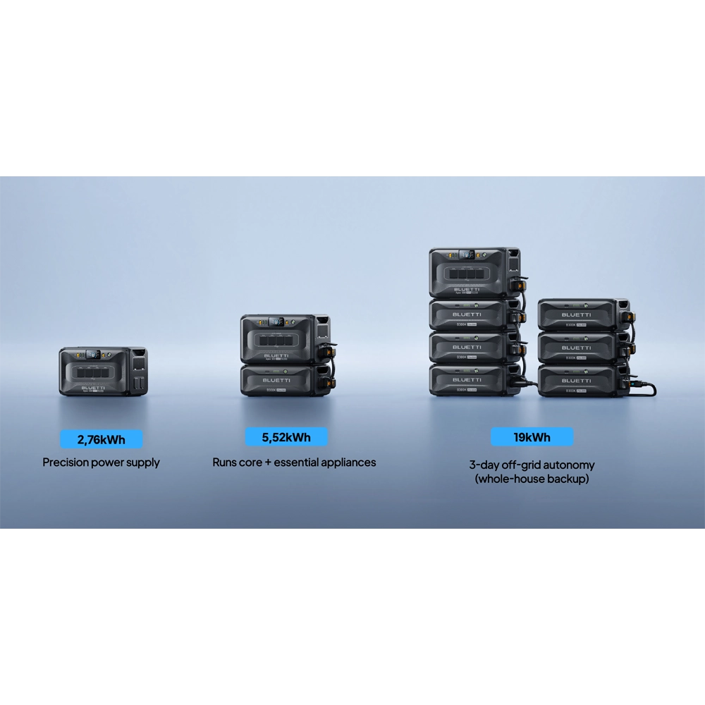 Bluetti Apex 300 este o stație modulară de backup energetic pentru locuințe, echipată cu un invertor robust și o baterie LiFePO₄ performantă, ideală pentru alimentarea casnică fără întreruperi. Este proiectat pentru a funcționa autonom sau în combinație cu module de extindere pentru capacitate și putere mărite.