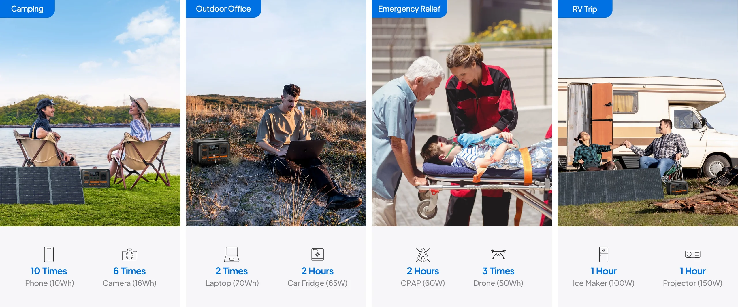 • Călătorii cu rulote/RV (încărcare rapidă AC+solar, suport auto)